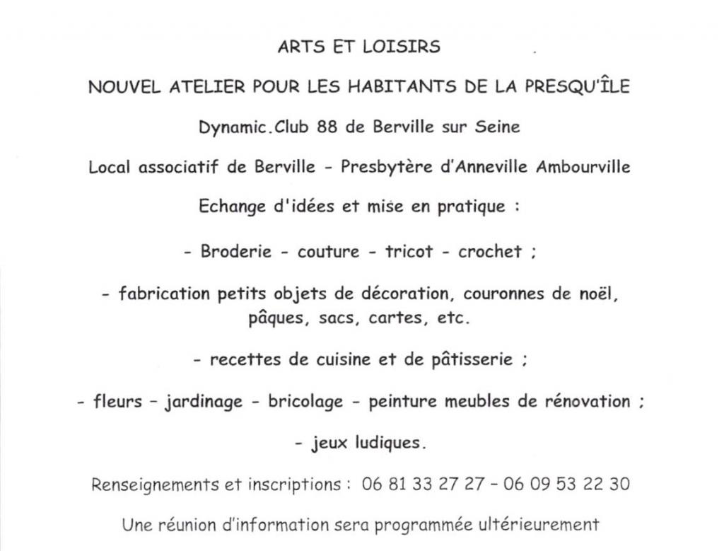 - Atelier peinture le jeudi de 14h30 à 17h. Une exposition réalisée par les adhérents est organisée tous les deux ans lors de la St Lubin à Berville-sur-Seine.